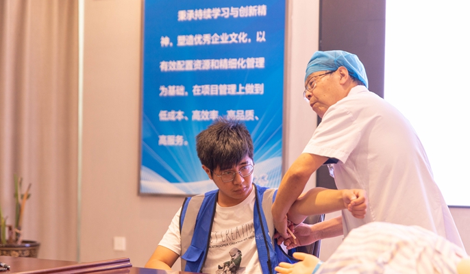 8月14日下午,中國十七冶集團上海分公司嘉定片區項目黨支部邀請當地醫院外科主任馬向富來到嘉定菊園項目部,為施工管理人員及班組長進行了一次緊急救護、健康知識普及講座。