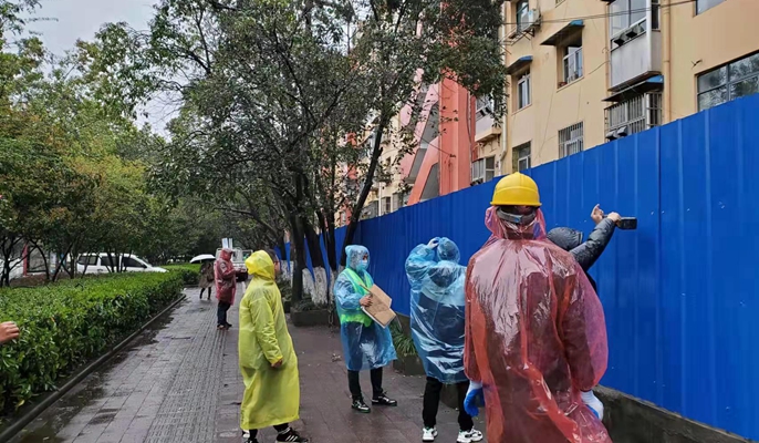 看到“大白”們早已疲憊,志愿者團隊們紛紛主動提出值守下半夜。就這樣時間來到凌晨一點半,天氣突然電閃雷鳴,開始下起小雨。志愿者們前往施工現場時走的匆忙,都沒有攜帶雨衣,為了不耽誤作業時間,依舊冒雨前行。項目總工呂旭看到后,蹬上小三輪返回項目部,搜刮一番找到了一些保暖衣物,拿到施工現場后,老同志們不愿意穿上要讓給年輕人,年輕人卻還都仗著身體健碩要讓給更有需要的人,就這樣傳來傳去,最后這些為數不多的保暖衣物來到了女志愿者們的身上。