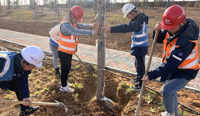活動現場,全體團員青年分工明確,揮動鐵鍬,挖掘坑穴,扶正樹苗,填土踩實,搭設支撐,培土圍堰,取水澆灌,一氣呵成。大家配合默契,干勁十足,經過兩個多小時的悉心栽植,一棵棵金絲垂柳樹苗排列整齊,傲然挺立。看著播種下的一抹新綠,大家雖有疲憊,但心中充滿了自豪。