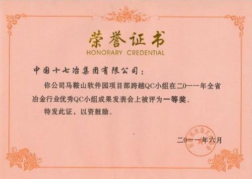 獲得獎項的還有:馬鞍山軟件園項目部跨越QC小組獲“優秀QC小組”一等獎1項;灌云風電場土建安裝工程、保證減定徑機組潤滑管道沖洗質量、提高梅鋼二期公輔工程砼建(構)筑物的觀感質量、馬鞍山市東部污水處理廠一期工程項目經理部等4個QC小組獲“優秀QC小組”三等獎;市政工程技術公司總工程師劉偉獲“QC小組活動卓越領導者獎”。