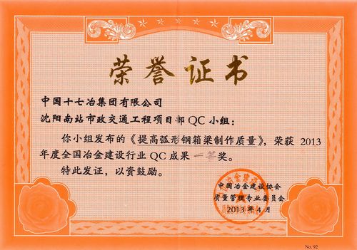日前,在中國冶金建設協會組織召開的2013年度全國冶金建設行業質量管理小組成果評審交流會上,中國十七冶集團城建工程技術公司沈陽南站市政交通工程項目部QC小組發布的《提高弧形鋼箱梁制作質量》榮獲一等獎。