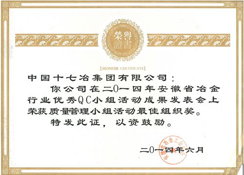 近日,從安徽省冶金工業協會獲悉,中國十七冶集團榮獲質量管理小組活動最佳組織獎和4項2014年安徽省冶金行業優秀QC小組活動成果二等獎。