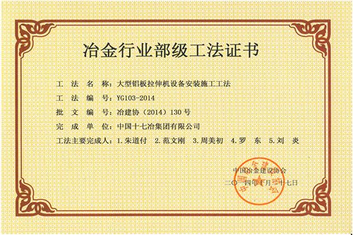 獲得2014年度冶金行業部級工法的有:冶金工程技術公司的《大型鋁板拉伸機設備安裝施工工法》、《鋼筋混凝土雙曲線冷卻塔移置模板施工工法》和《500kA鋁電解槽現場制作施工工法》,風力與太陽能發電工程技術公司的《2000kW風力發電機拆除施工工法》和《沿海灘涂太陽能光伏發電施工工法》。