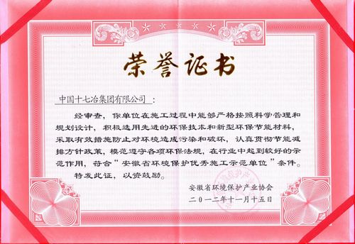 日前,從安徽省環(huán)保廳產(chǎn)業(yè)協(xié)會(huì)獲悉,中國(guó)十七冶集團(tuán)榮獲2012年度“安徽省環(huán)境保護(hù)優(yōu)秀施工示范單位”稱號(hào)。