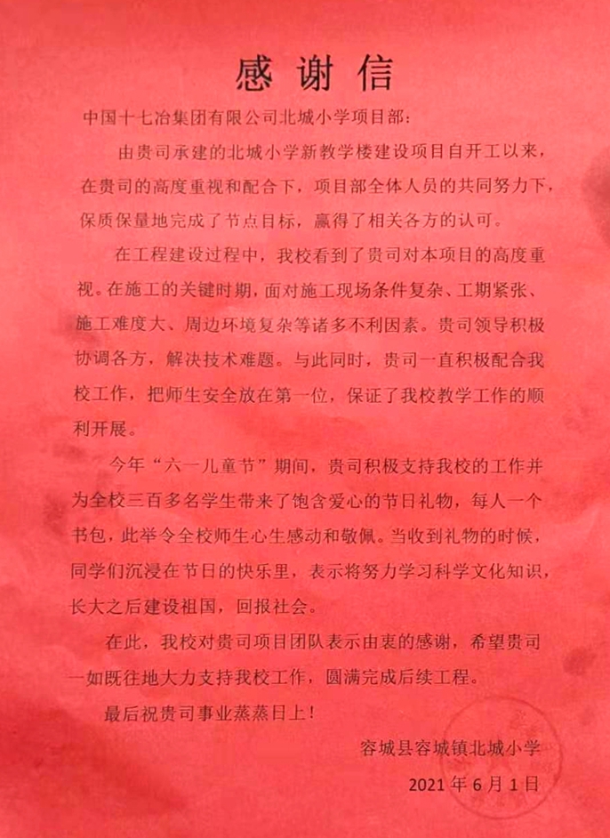 6月1日,河北保定容城縣容城鎮北城小學向中國十七冶集團致感謝信并贈送錦旗,對十七冶交通分公司北城小學新教學樓建設項目部保質保量地完成節點目標以及對工程建設的高度重視和配合致以誠摯感謝。