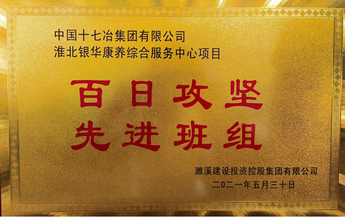 5月30日,中國十七冶集團市政分公司淮北銀華康養項目榮獲濉溪縣建設投資控股集團有限公司頒發的“百日攻堅先進班組”稱號。