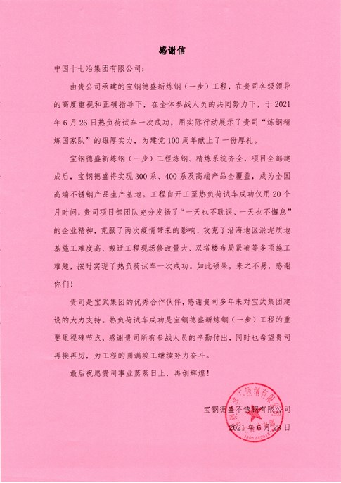 近日,寶鋼德盛不銹鋼有限公司向十七冶致感謝信,對十七冶項目管理團隊保質保量完成各項節點目標給予高度贊譽。